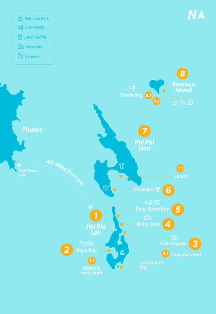 The Phi Phi Islands are a group of islands located in the Andaman Sea, off the west coast of Thailand. The most well-known islands in the group are Phi Phi Don and Phi Phi Leh. Phi Phi Don is the larger and more developed island, whereas Phi Phi Leh is smaller and remains uninhabited. Phi Phi Islands are renowned for their stunning white sand beaches, crystal-clear waters, and dramatic limestone cliffs. Some of the popular attractions and activities you might find on a typical Phi Phi Islands trip include-